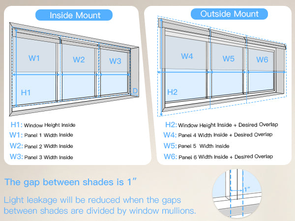 • Outside Mount: Measure the area to cover, including the valance/cassette. Add 6" to both width and height to reduce light leakage.