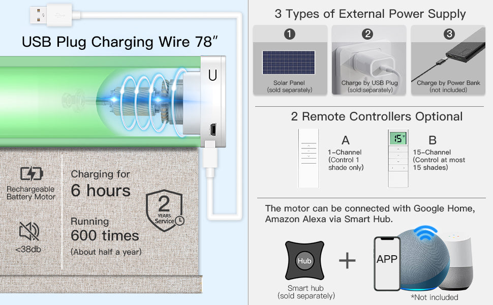 The motor is powered by a built-in rechargeable battery that lasts for months on a single charge. When paired with a solar panel, charging concerns are eliminated. An RF hub/bridge is required for connection to Alexa, Google Assistant, and other smart home systems. Two remote control options are available: