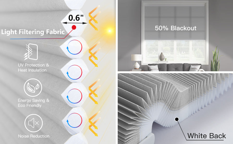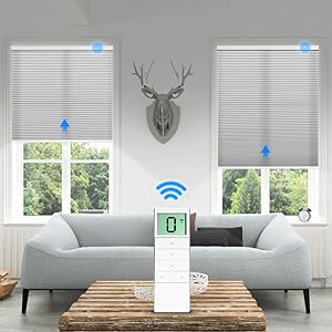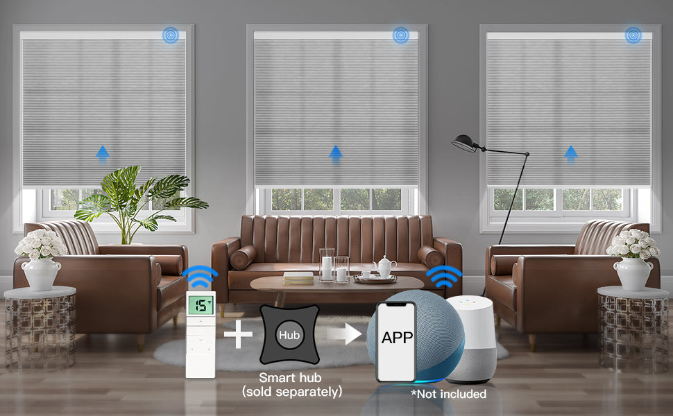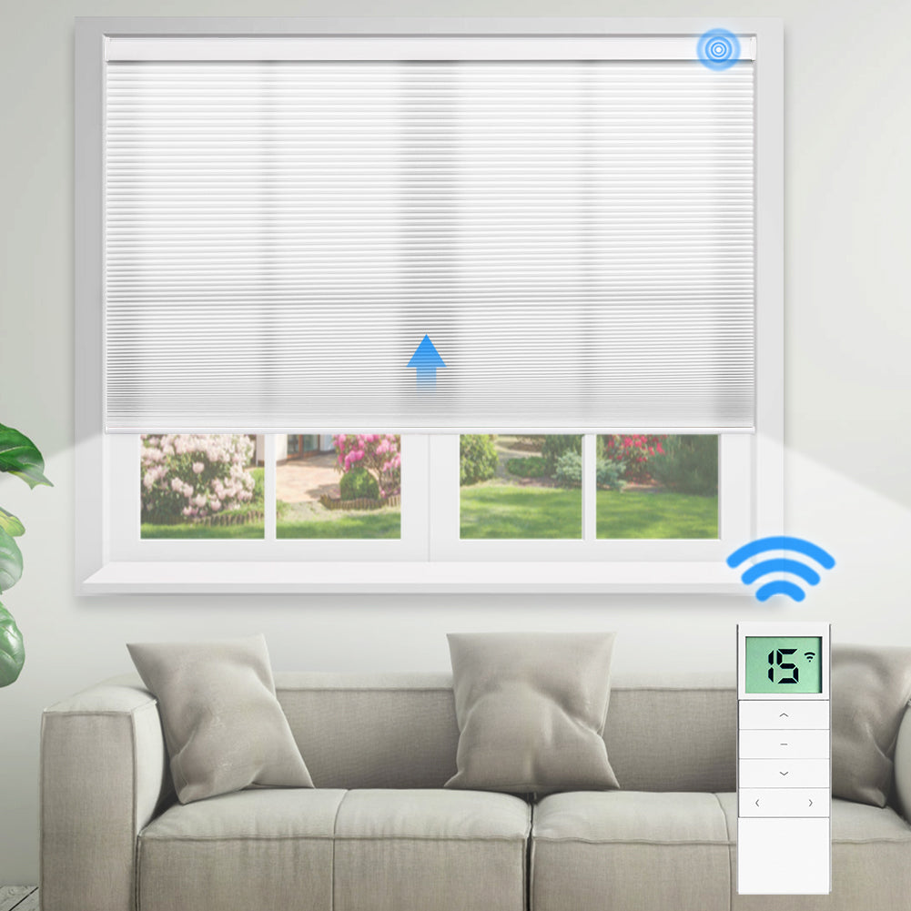 Made with 50%-80% blackout fabric, these motorized cellular shades filter natural light while maintaining privacy. The unique honeycomb-shaped fabric cells expand and contract as the shade is raised or lowered, providing energy efficiency, noise reduction, and UV protection. The cordless design ensures a safe environment for children and pets. Perfect for living rooms, bedrooms, kids' rooms, home offices, media rooms, and offices. For indoor use only.
