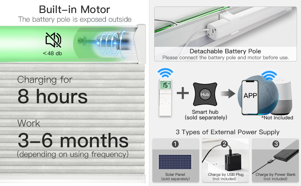 Equipped with a built-in motor and a detachable rechargeable battery pole, conveniently exposed for easy access. A full charge lasts for months, and pairing with a solar panel eliminates charging concerns. An RF hub is required to connect with Alexa, Google Assistant, and other smart home systems. Choose from two remote control options: