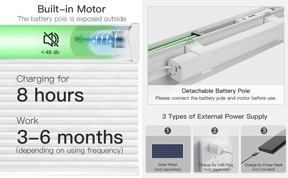 Equipped with a built-in motor and a detachable rechargeable battery pole, conveniently exposed for easy access. A full charge lasts for months, and pairing with a solar panel eliminates charging concerns. Choose from two remote control options: