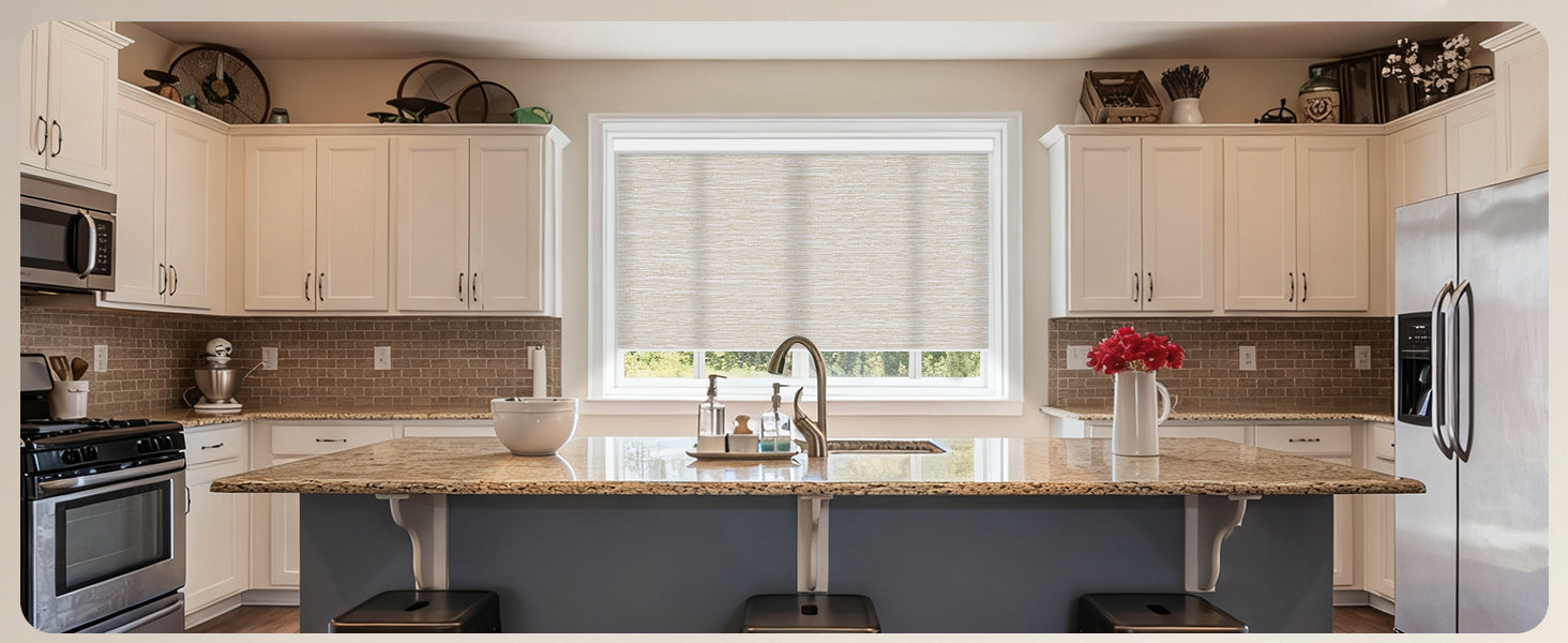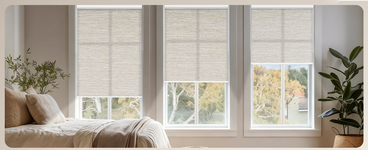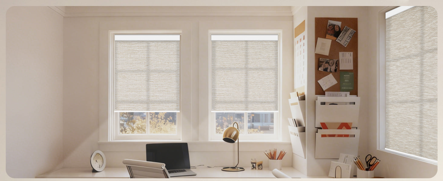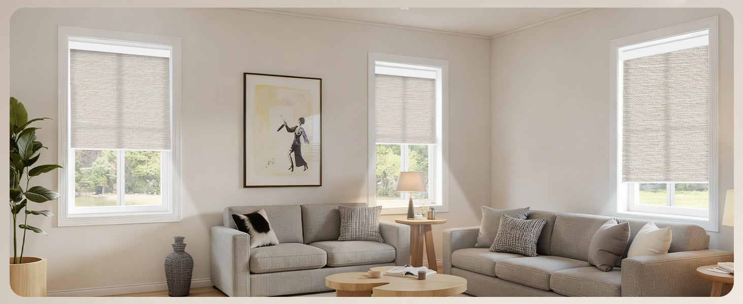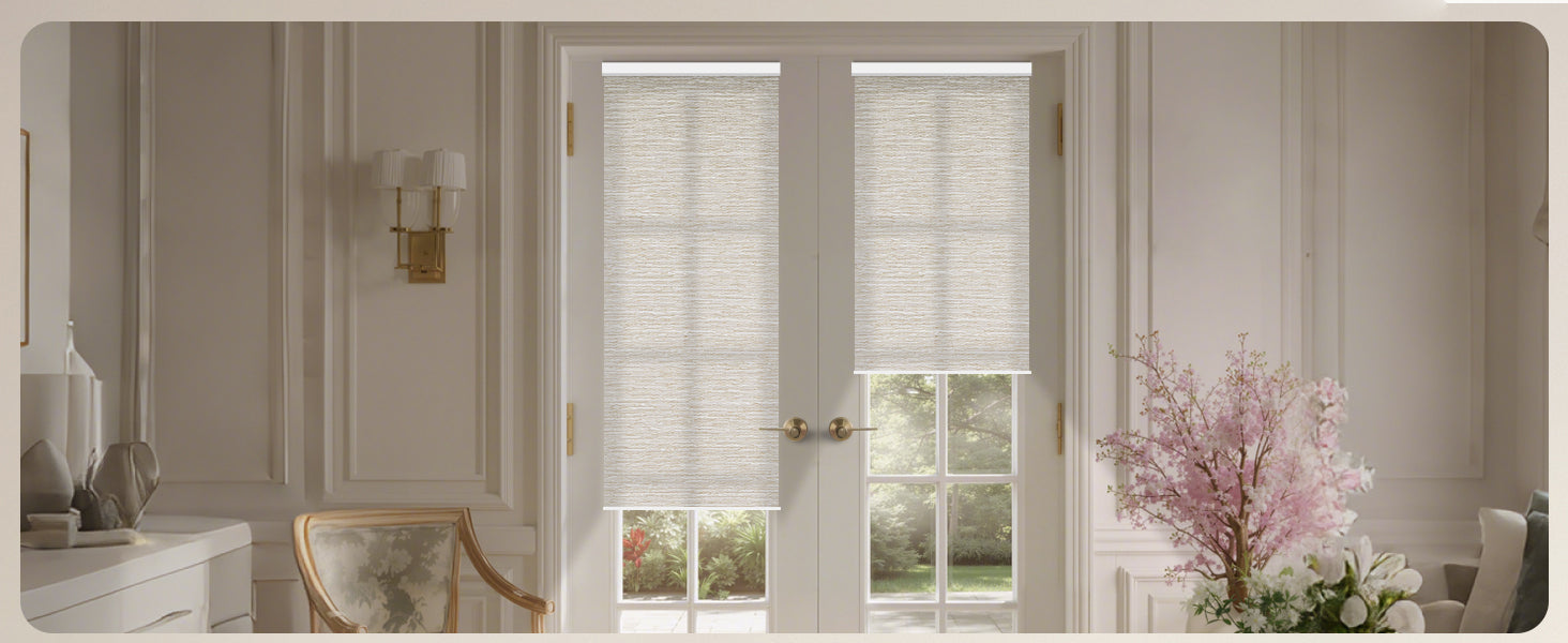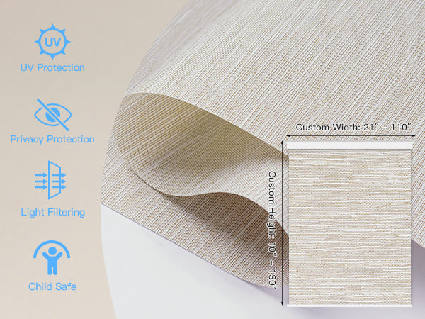 Made from 40%-60% blackout polyester fabric, this material protects from UV rays while allowing natural light to filter through. It offers excellent privacy by blocking visibility from the outside. The cordless design ensures a child- and pet-safe environment. Perfect for living rooms, patio sliding doors, kitchens, offices, and more. For indoor use only.