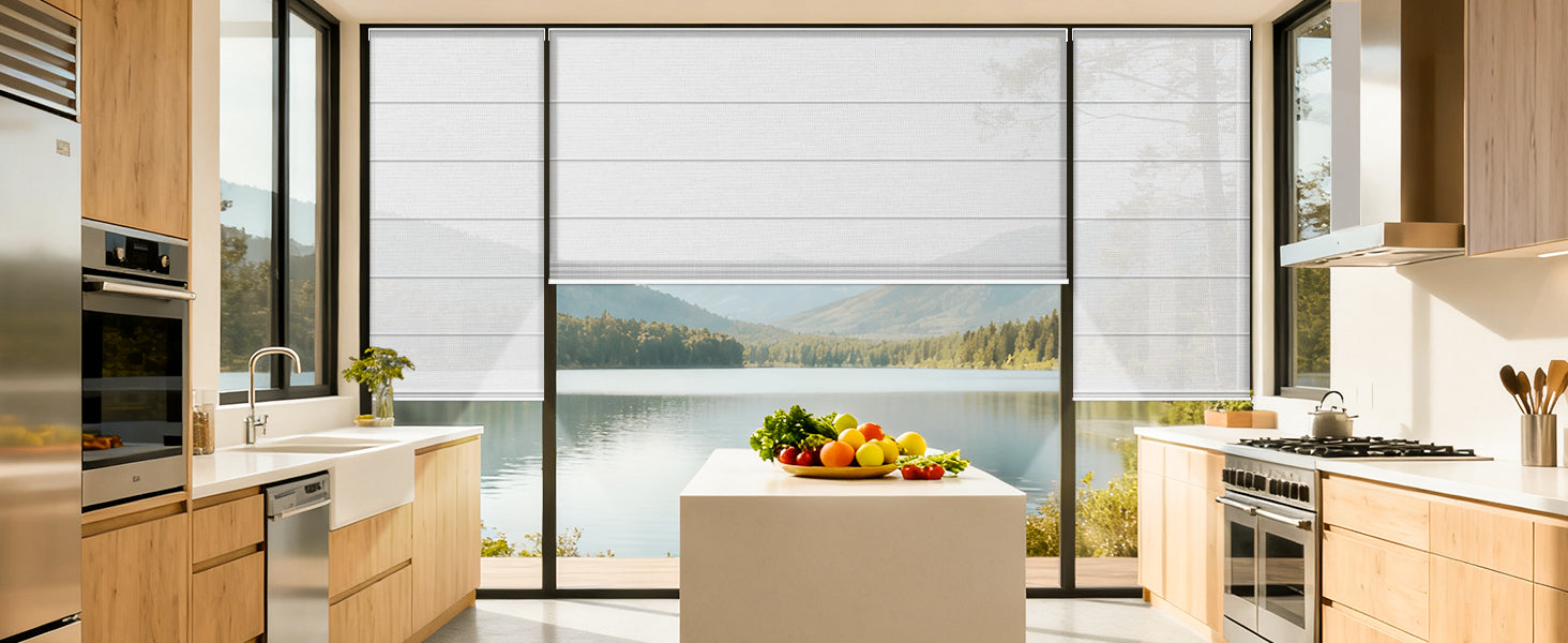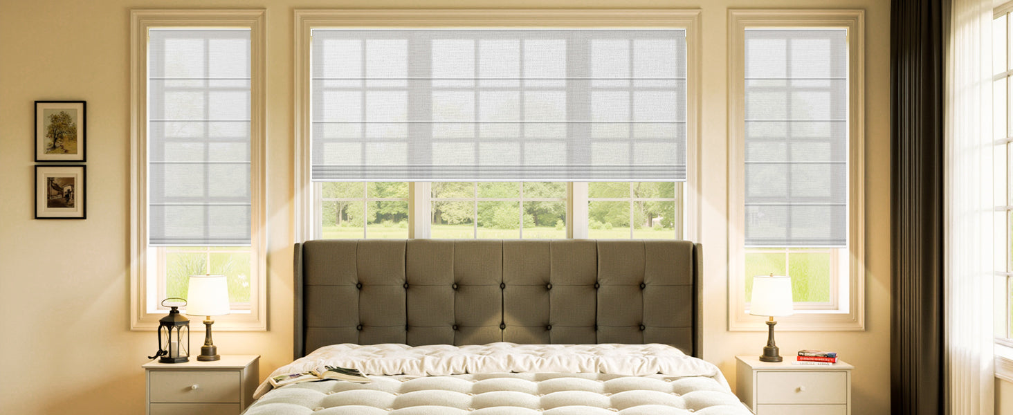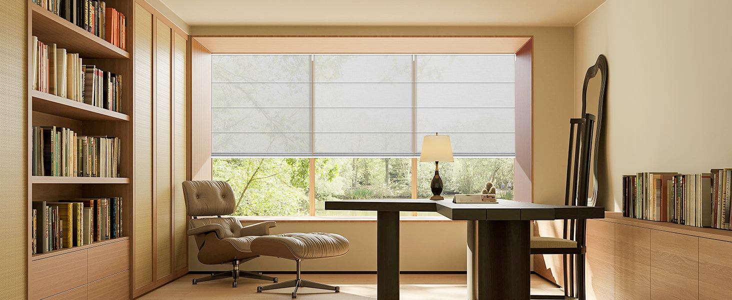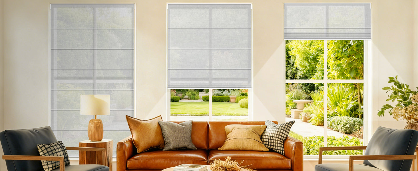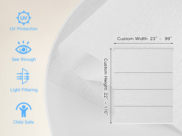 Semi-sheer Roman shades provide 20%–30% blackout, softly diffusing sunlight while maintaining privacy and UV protection. The elegant jacquard texture adds warmth without fully darkening the room. Cordless, motorized design is safe for kids and pets. Indoor use only.